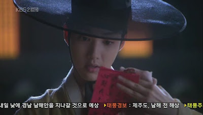 Saat Menteri Ha Byungpan dan rombongannya akan berbalik, mereka melihat ada kertas berwarna merah berterbangan diudara. Lalu ada seorang pemuda yang naik ke atap (itu pasti Moon Jae Shin yang keren itu, maaf ka iis di SKK ini april juga suka Moon Jae Shin a.ka. Yoo Ah In) dan menyusuri atap dengan lincahnya (jadi inget ijun oppa di Iljimae). Dari atap pemuda itu melesatkan anak panahnya jauh mengenai sesuatu dan berjatuhan lah kertas berwarna merah itu ketangan warga.